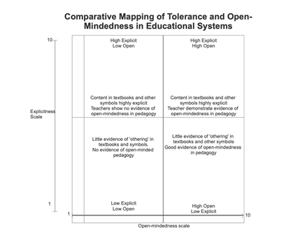 As depicted in the following scale by Johnson, two axes come together to determine the nature of an education system. Content is part of the explicitness scale, while context and culture belong to the open-mindedness scale. Therefore even if there is “little evidence of othering in textbooks and symbols”, if the open-mindedness scale is at the lower end, it cannot support a prosperous society.