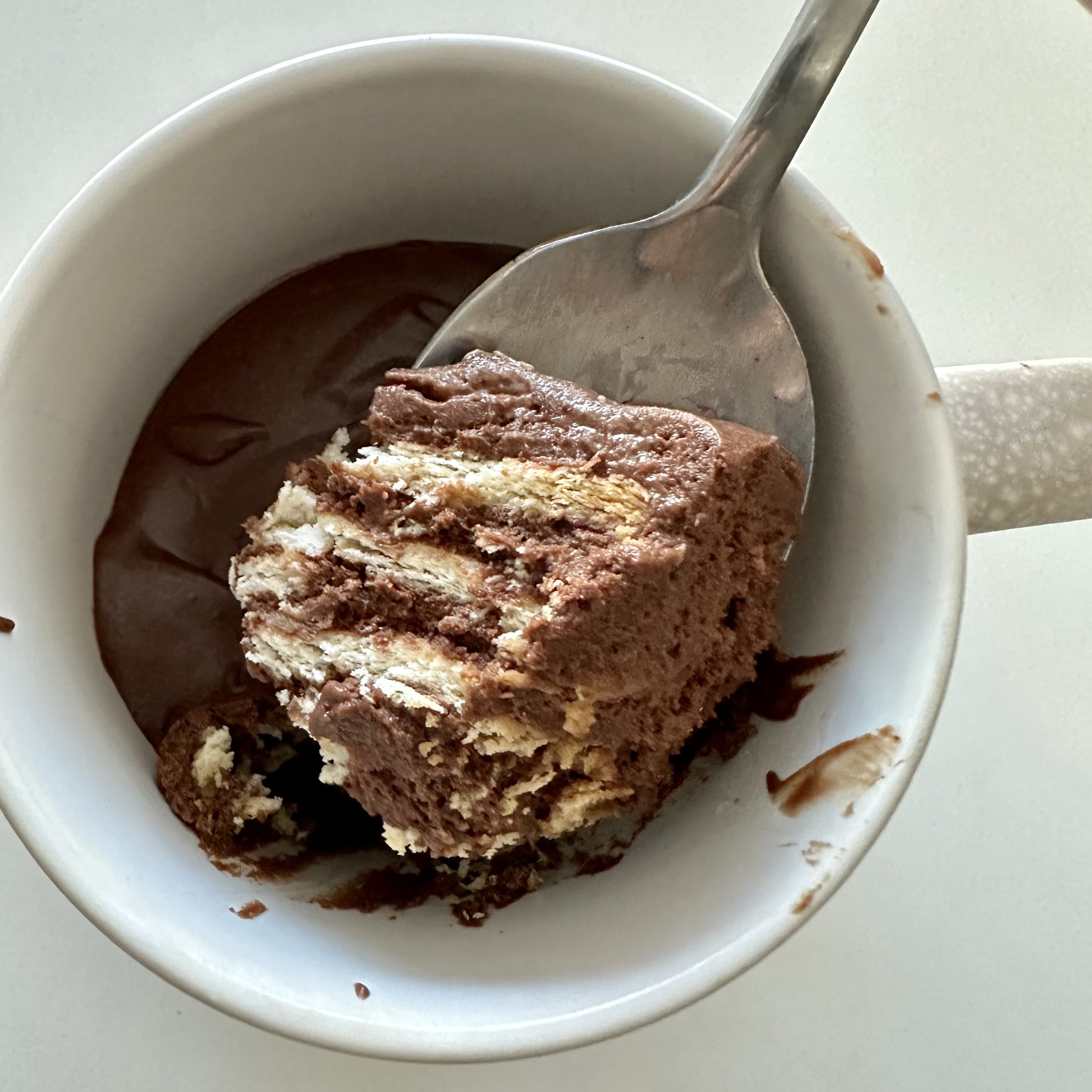 Mousse was immediately assembled with layers of Maliban Gold Marie soaked in milk. Assembling before chilling makes the process easier.