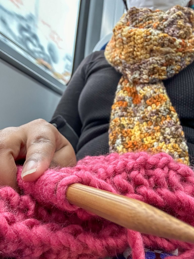 I knit at home. I knit at university when I’m taking a break between writing sessions. I knit on the train. I knit in parks. I knit in cafes. Since yesterday, I knit on benches by the road. I’m on my fourth project right now. None of these are perfect. However, according to Mrs Zimmerman, I am properly practicing knitting.